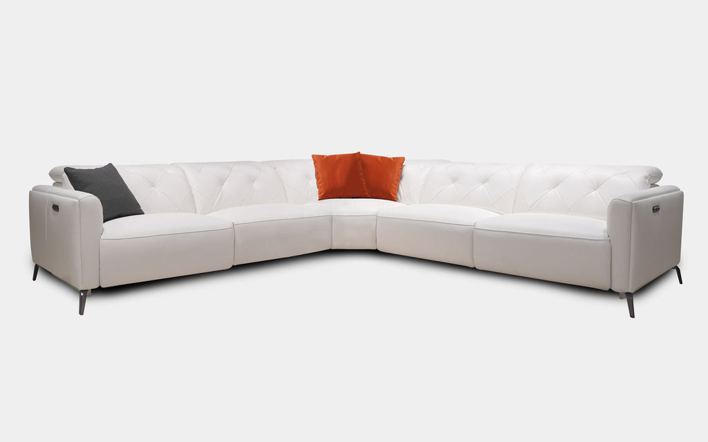This customizable sectional is available in a range of material and color options. The inner power recliner control panel located on both ends of the armrests comes with conveniently placed USB ports. This modern sectional sofa is the perfect accent piece for any living room, entertainment room, bedroom, or loft. Made both stylish and functional, the handcrafted diamond-shaped tufted backrests and headrests add to the already rich design making this a tufted sectional. This unique sectional sofa makes relaxing comfortable. The detailed stitching and piping patterns throughout the entire modern sectional present a clean and pristine overview. The modular sectional couch highlights its spotlight features through unique and various configurations, the possibilities are endless. Build your own sectional couch. A one of a kind modular sofa.